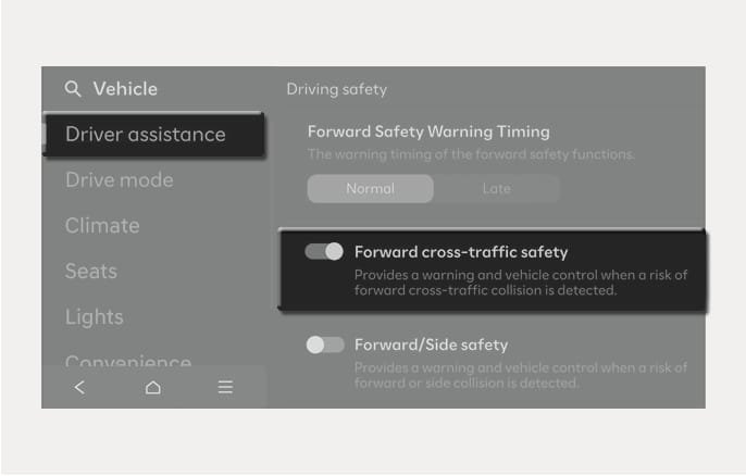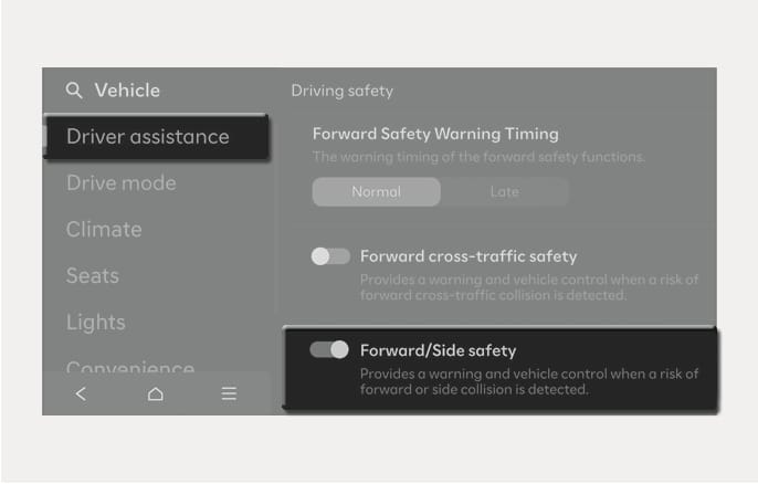 При работающем двигателе выберите Настройки > Автомобиль > Ассистент водителя > Безопасность вождения > Безопасн-ть спереди/сбоку в меню настроек информационно-развлекательной системы, чтобы включить или выключить функции подготовки к перестроению — встречные автомобили, подготовки к перестроению — автомобили сбоку и уклонения от столкновения.