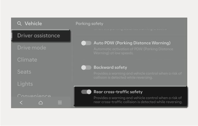 При работающем двигателе выберите Настройки > Ассистент водителя > Безопасная парковка > Пересек. движение сзади в меню настроек информационно-развлекательной системы, чтобы включить или выключить функцию предотвращения столкновения с объектами, движущимися в поперечном направлении позади автомобиля.