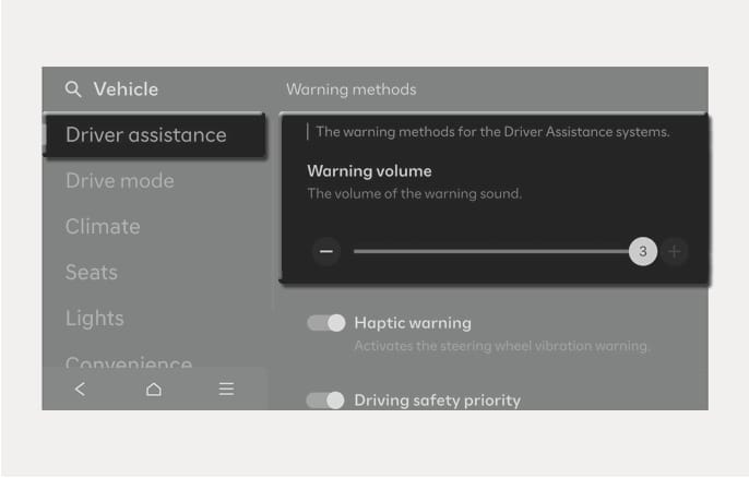 Громкость предупреждений: Для изменения громкости предупреждений в меню настройки информационно-развлекательной системы выберите Настройки > Автомобиль > Ассистент водителя > Звуковые и тактильные предупреждения > Громкость предупреждений.