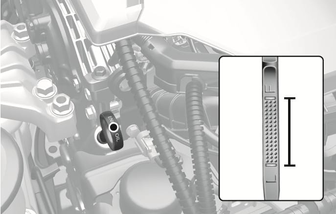 Если уровень масла находится ниже метки «L» (низкий), долейте такое количество масла, чтобы уровень поднялся до метки «F» (полный).