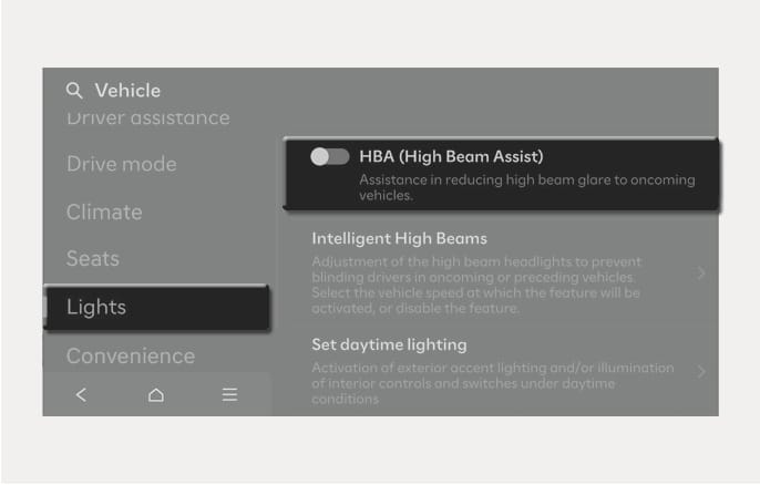 Когда кнопка «Engine Start/Stop» находится в положении включения («ON»), выберите Настройки > Автомобиль > Свет > HBA (автопереключение дальнего света) в меню настройки, чтобы включить или выключить систему автоматического переключения фар дальнего света.