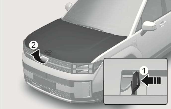 Подойдите к автомобилю спереди, слегка приподнимите капот, потяните вверх за второй рычаг открывания капота (1), расположенный изнутри по центру капота, и приподнимите капот (2).
