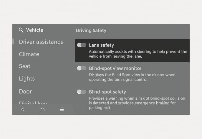 With the engine on, select Setup > Vehicle > Driver Assistance > Driving Safety > Lane Safety from the settings menu in the infotainment system to set whether to use each function.