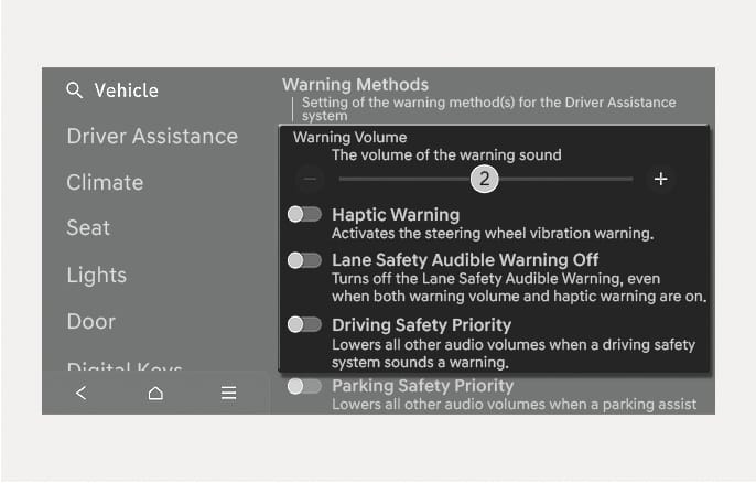 If Driving Safety Priority is selected, the vehicle lowers all other audio volumes when the warning sounds for safe driving.