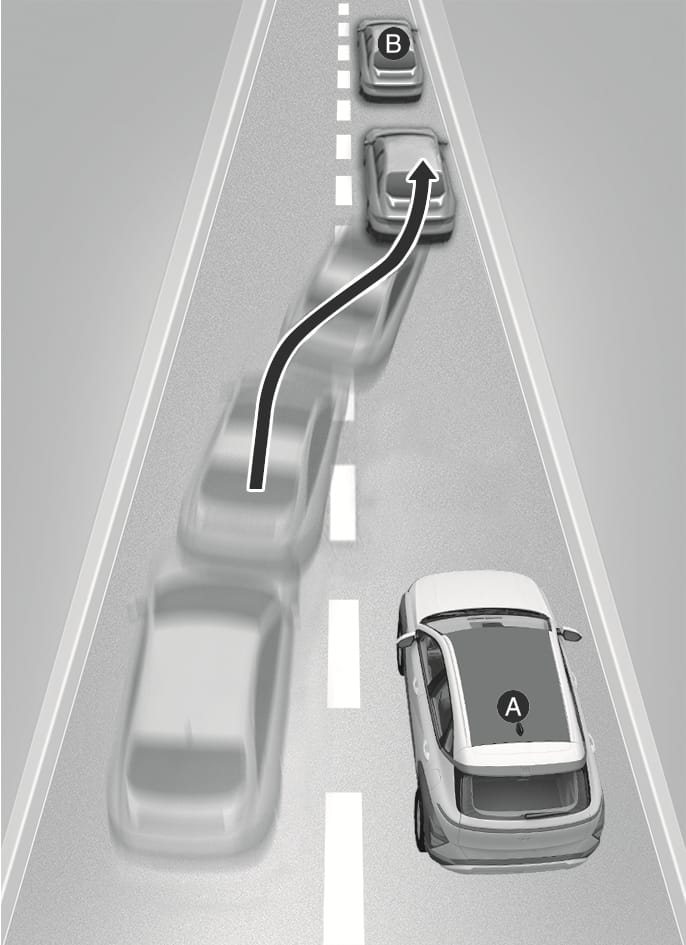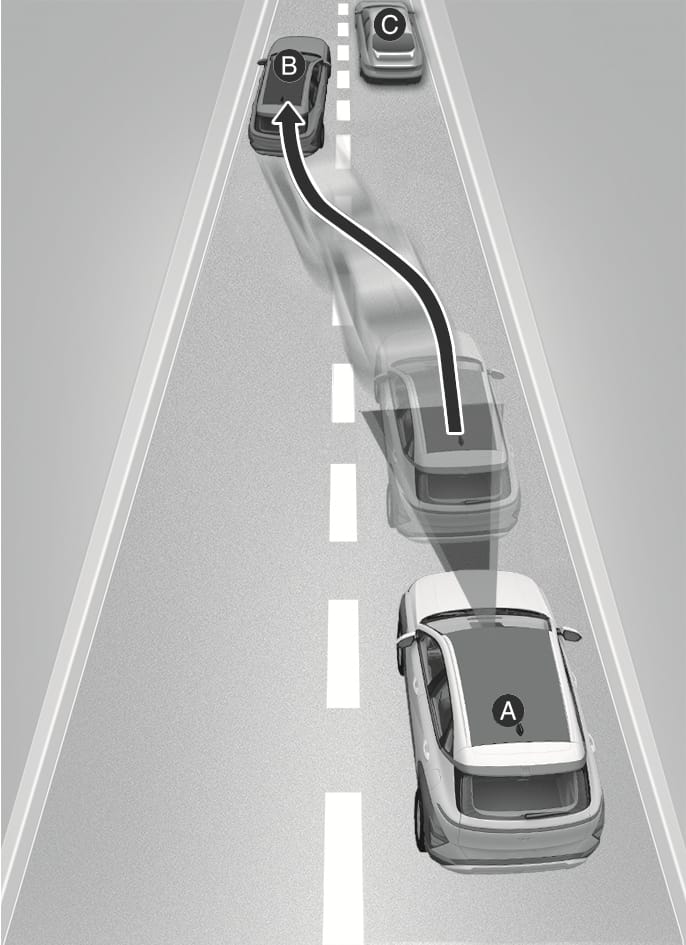 When a vehicle moves into your lane from an adjacent lane, it cannot be detected by the sensor until it is in the sensor's detection range. Forward Collision-Avoidance Assist may not immediately detect the vehicle when the vehicle changes lanes abruptly. In this case, you must maintain a safe braking distance, and if necessary, steer your vehicle and depress the brake pedal to reduce your driving speed in order to maintain a safe distance.