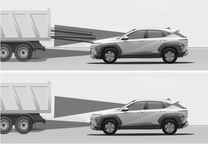 If the vehicle in front of you has cargo that extends rearward from the cab, or when the vehicle in front of you has higher ground clearance, additional special attention is required. Forward Collision-Avoidance Assist may not be able to detect the cargo extending from the vehicle. In these instances, you must maintain a safe braking distance from the rearmost object, and if necessary, steer your vehicle and depress the brake pedal to reduce your driving speed in order to maintain distance.