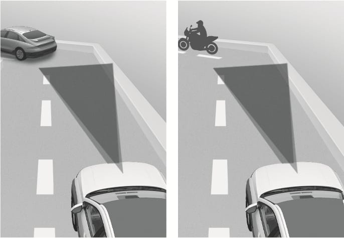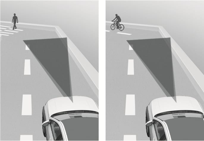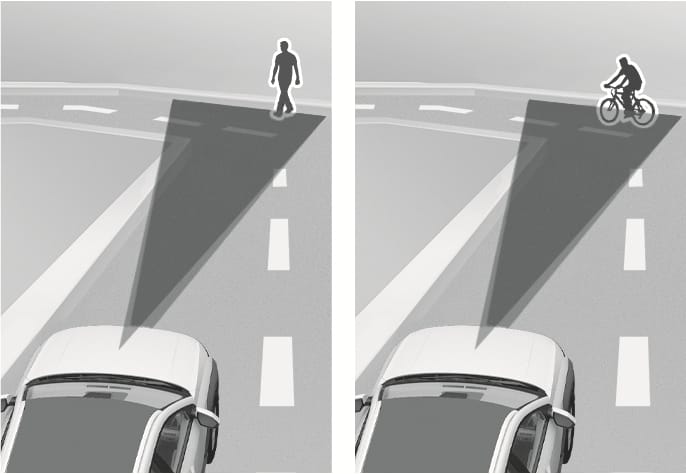 The illustration above shows the image the front view camera and front radar are capable of detecting as a vehicle, powered two-wheeler, pedestrian, or cyclist.