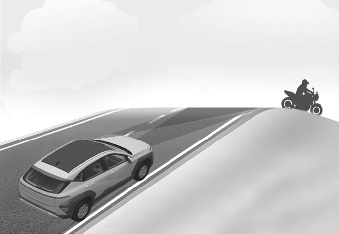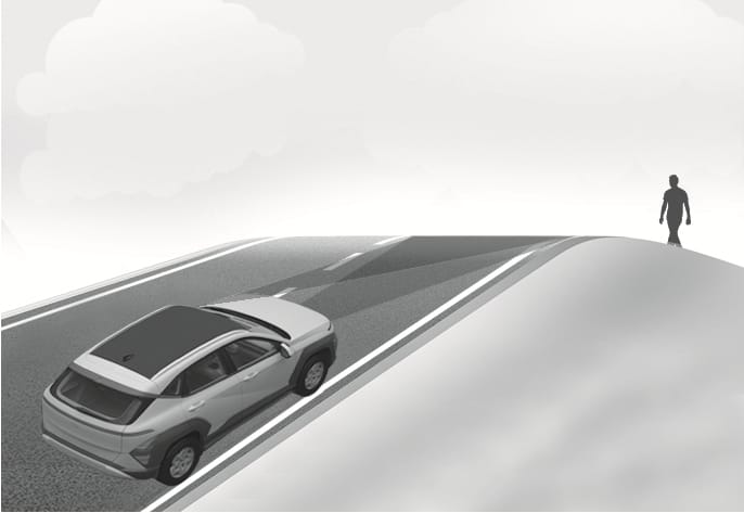 Always have your eyes on the road while driving uphill or downhill and if necessary, steer your vehicle and depress the brake pedal to reduce your driving speed in order to maintain a safe distance.