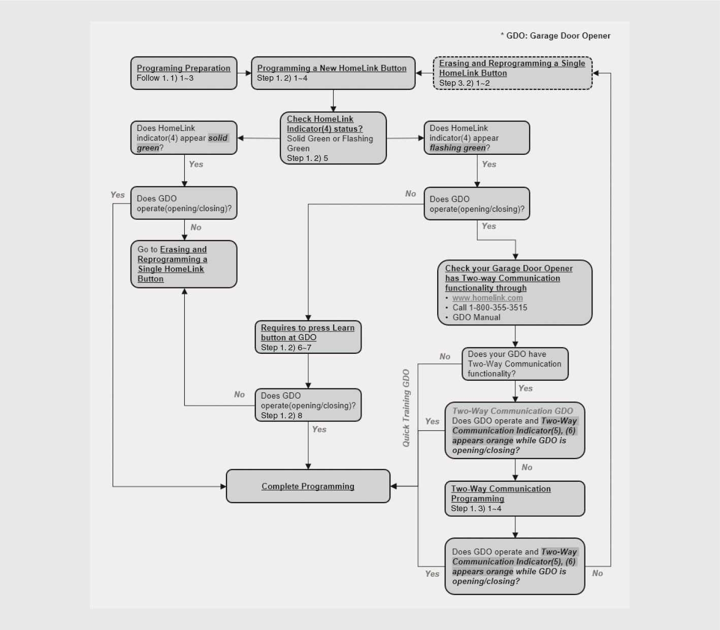 The following steps show how to program HomeLink. If you have any questions or are having difficulty programming your HomeLink buttons, refer to the HomeLink website or call the HomeLink customer support toll-free number. Do this, before going back to the dealer who sold you the vehicle.