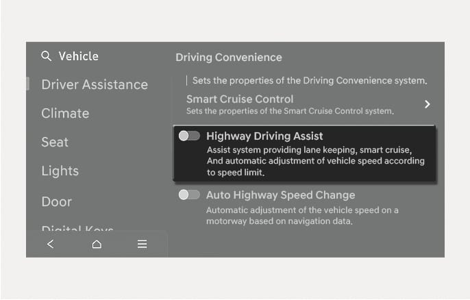 Highway Driving Assist settings