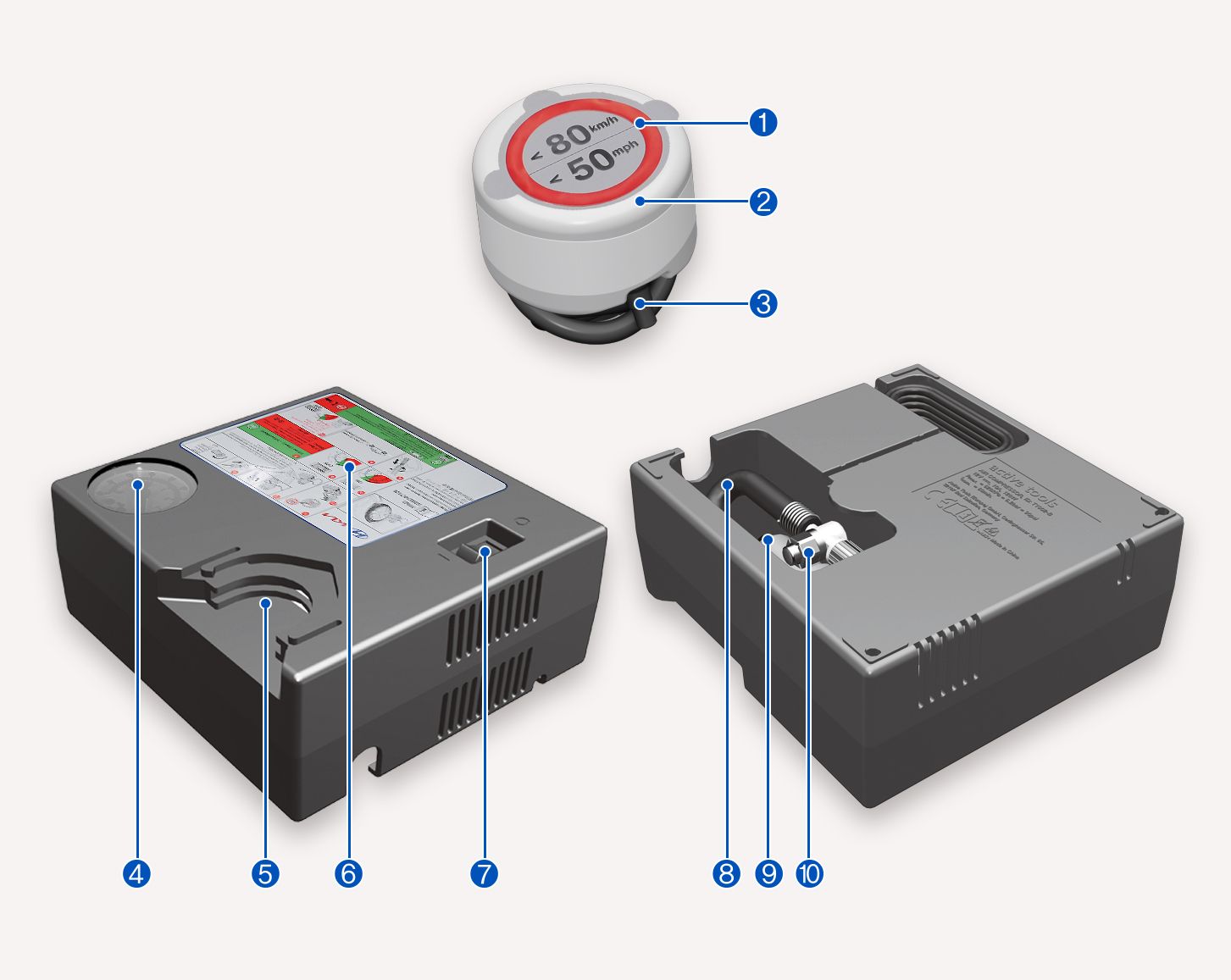 타이어 응급 처치 키트를 사용하기 전에 컴프레서에 부착된 설명서를 주의 깊게 읽으십시오.