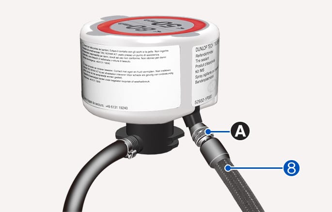 컴프레서 측 주입 호스(8)를 실런트 용기 주입호스 연결부[A]에 연결하여 고정하십시오. 실런트(봉합제) 용기를 주입 호스가 위를 향하도록 세워 두십시오.