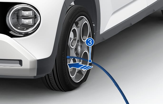 손상된 타이어의 휠 공기 주입구 캡을 열고 실런트(봉합제) 주입 호스(3)를 휠 공기 주입구에 연결하십시오.