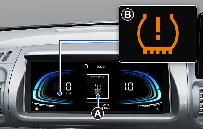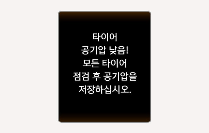 타이어 공기압 경보 시스템에만 의존하지 말고 안전한 주행을 위해 정기적으로 타이어 공기압을 점검하고, 필요 시 당사 직영 하이테크센터나 블루핸즈를 방문해 타이어 상태를 점검한 후 타이어 공기압을 조절하십시오.