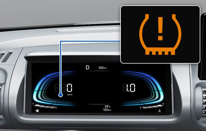 저압 타이어 경고등이 켜지면 속도를 낮추고 급격한 조향을 피하며 당사 직영 하이테크센터나 블루핸즈를 방문해 타이어 상태를 점검한 후 타이어 공기압을 조절하십시오.