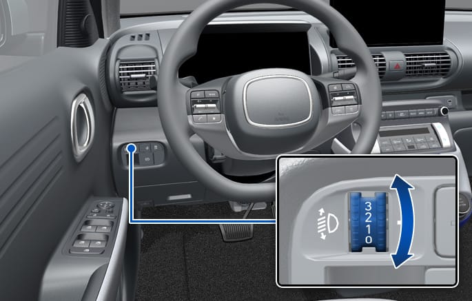 전조등 각도를 내리려면 조절 스위치를 위로 돌리십시오(레벨3 방향)