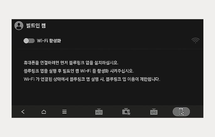 빌트인 캠 화면의 휴대폰 연결 메뉴에서 Wi-Fi 활성화를 선택하여 연결이 가능한 상태로 만드십시오.
