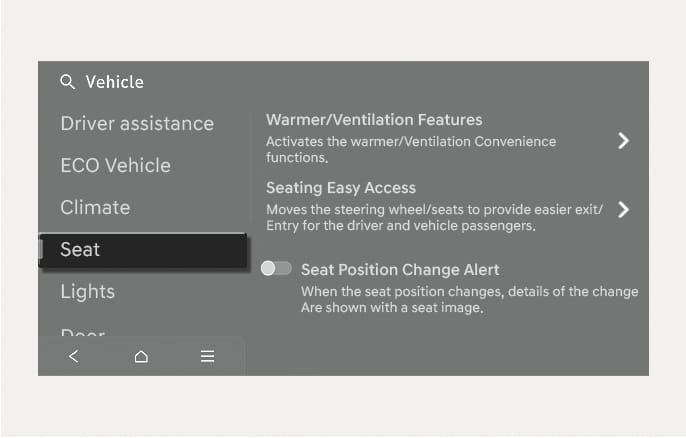 Select Settings > Vehicle > Seat from Settings menu the infotainment system, you may use various convenience functions.