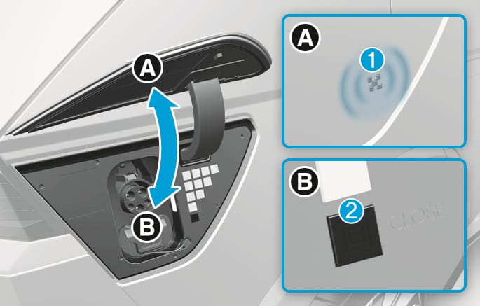 Wenn sich das Getriebe in P (Parken) befindet, drücken Sie die Ladeklappe zum Öffnen (1).