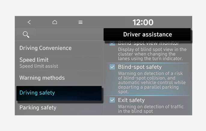 If Blind-spot safety is selected, Blind-Spot Collision-Avoidance Assist warns the driver with a warning message, an audible warning depending on the collision risk levels. Braking assist is applied for parking exit depending on the collision risk levels.
