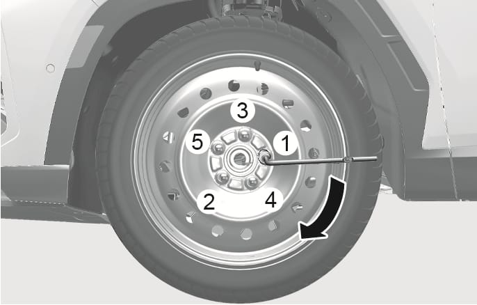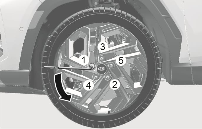 Use the wheel lug wrench to tighten the lug nuts in the order shown. Double-check each lug nuts until they are tight. After changing tires, have the vehicle inspected by an authorized HYUNDAI dealer tighten the lug nuts to their proper torque as soon as possible. The lug nut should be tightened to 79-94 lbf. ft (11-13 kgf.m).