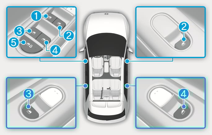 - 뒷좌석(좌측) 유리창 열림/닫힘 스위치