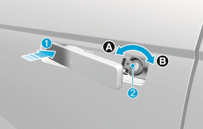 도어 핸들 뒷 부분 안쪽 키 홀(2)에 비상 키를 넣고 오른쪽으로 돌려 잠금을 해제하십시오.