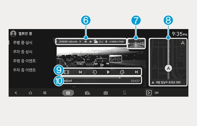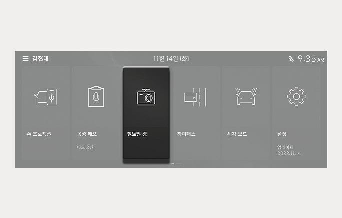 녹화된 빌트인 캠 영상을 확인하려면 인포테인먼트 시스템 홈 화면에서 빌트인 캠을 선택하십시오.