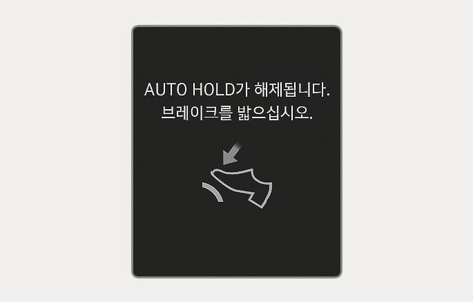 클러스터에 자동 정차가 해제된다는 경고문이 표시되는 경우 자동 정차 기능과 주차 브레이크가 작동하지 않을 수 있습니다. 이런 경우 직접 브레이크 페달을 밟아 정차 상태를 유지하십시오.