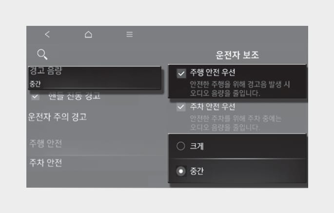 경고 음량을 변경하면 다른 운전자 보조 시스템의 경고 음량도 같이 변경될 수 있습니다. 고려하여 변경하십시오.