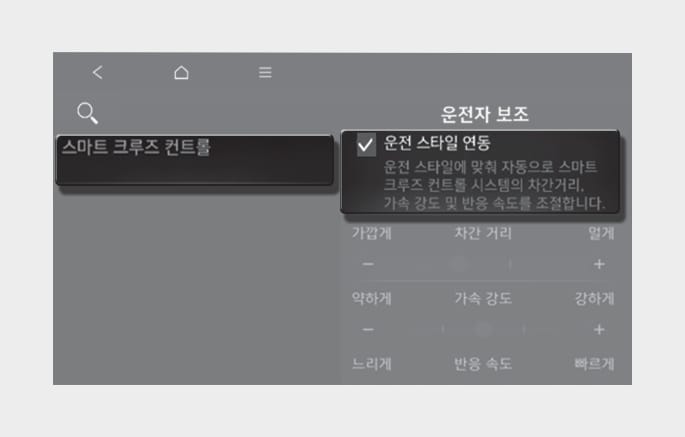 운전 스타일 연동을 지원하는 경우에만 인포테인먼트 시스템의 설정 → 차량 → 운전자 보조→주행 편의 → 스마트 크루즈 컨트롤 메뉴에서 운전 스타일 연동을 선택할 수 있습니다.
