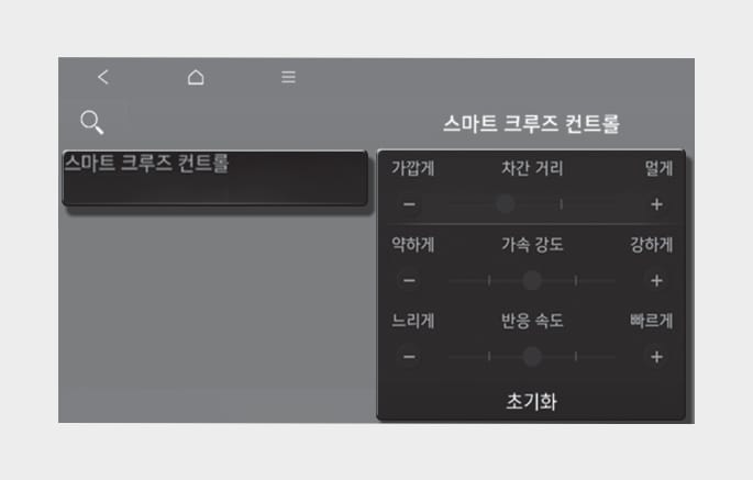 시동 ‘ON’ 상태에서 인포테인먼트 시스템의 설정 → 차량 → 운전자 보조 → 주행 편의 → 스마트 크루즈 컨트롤을 차례로 선택하십시오. 차간거리, 가속 강도, 반응 속도를 개별적으로 설정할 수 있습니다.