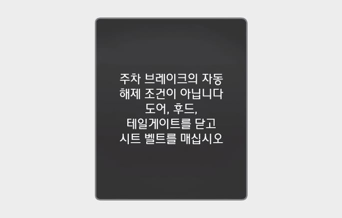 아래의 경우에는 경고음이 한 번 울리고 LCD 표시창에 경고문이 표시됩니다. 경고문이 표시되면 브레이크 페달을 밟은 상태에서 전자식 파킹 브레이크(EPB) 스위치를 눌러 파킹 브레이크를 해제하고 출발하십시오.