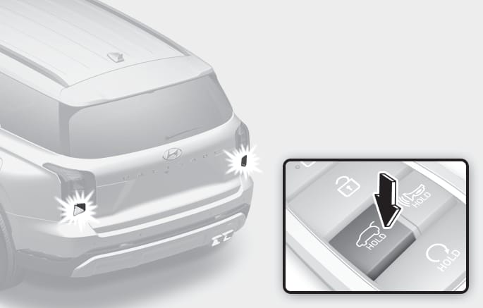 비상경고등이 2회 깜빡여 테일게이트가 잠금 해제 상태임을 알려줍니다. 잠금 해제 후 약 30초 이내에 테일게이트를 열지 않으면 다시 잠깁니다.
