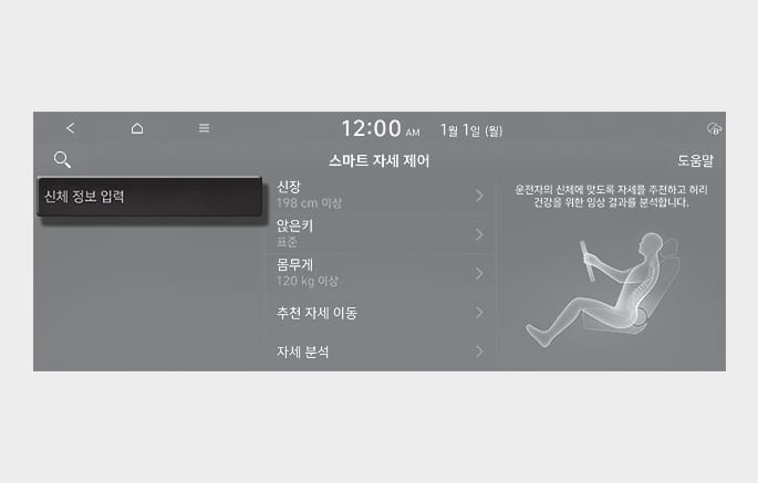 인포테인먼트 시스템의 설정 → 차량 → 시트 → 스마트 자세 제어 → 신체 정보 입력을 선택하여 운전자의 신체 정보를 입력하십시오.