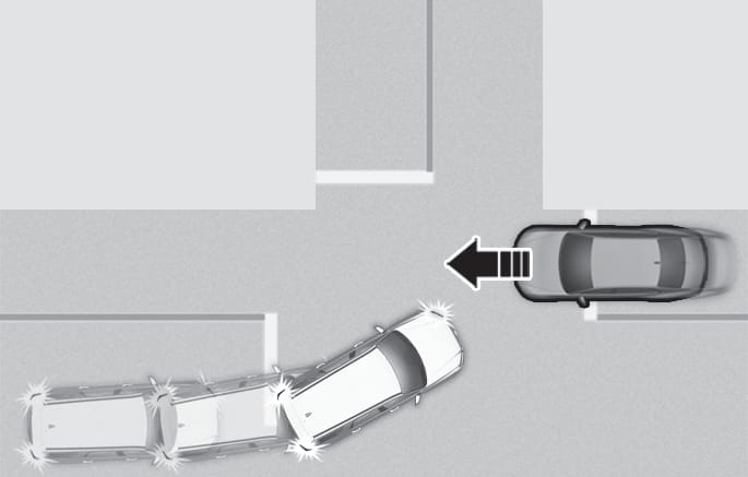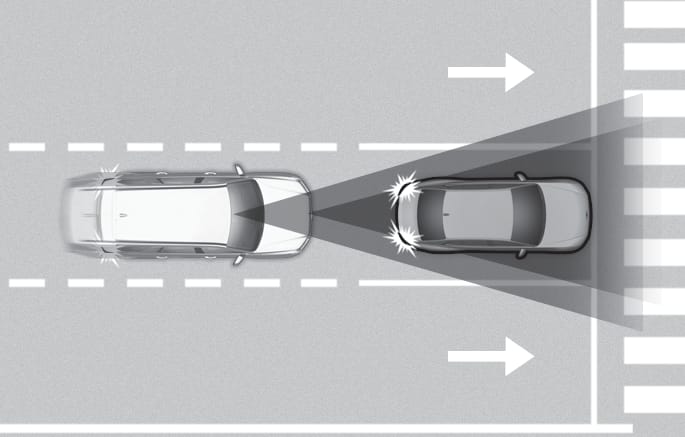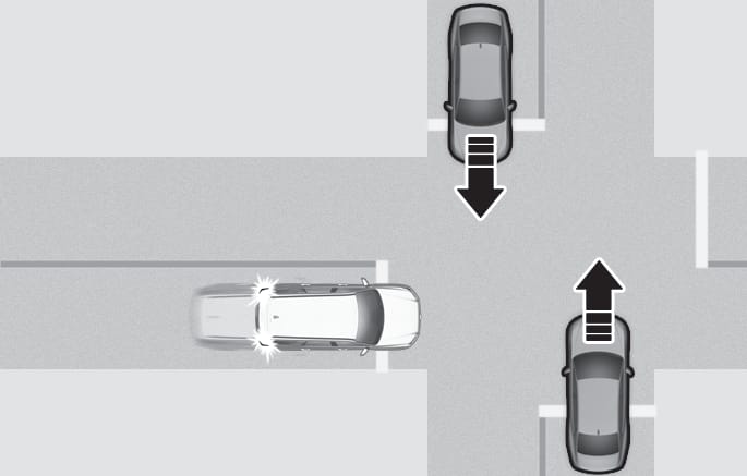 교차로 직진 시 좌우 방향에서 접근하는 차량과의 충돌 위험이 판단되면 충돌 경감 또는 회피하도록 제동을 도와줍니다.