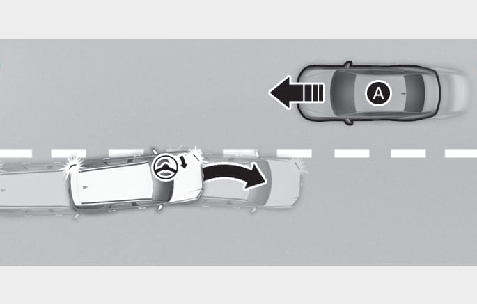 차로변경 시 맞은편에서 다가오는 차량과의 충돌 위험이 판단되면 충돌 경감 또는 회피하도록 조향을 도와줍니다.
