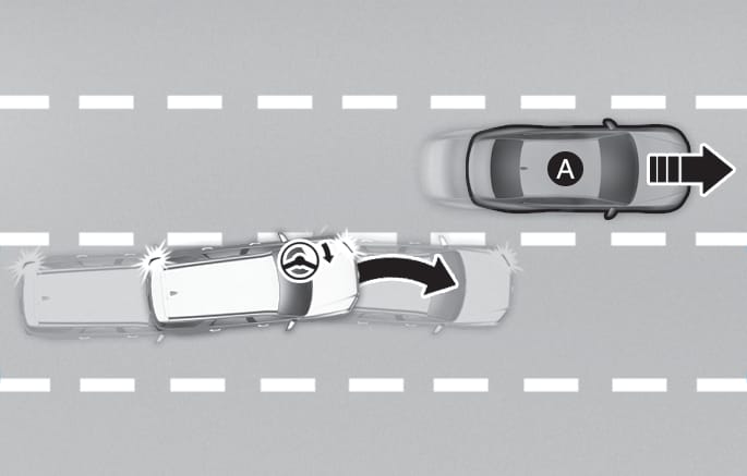 고속 주행 시에도 좌우 인접 차로 및 전방의 차량을 인식하여 운전자가 차로변경을 하여도 충돌을 피하기 어렵다고 판단되면 충돌 경감 또는 회피하도록 제동을 도와줍니다.(사양 적용 시)