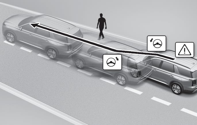 차로 내 전방의 보행자 및 자전거 탑승자와의 충돌 위험이 판단되어 경고가 발생하고 주행 중인 차로 내에서 회피 가능한 공간이 있을 경우 회피 조향을 도와줍니다.