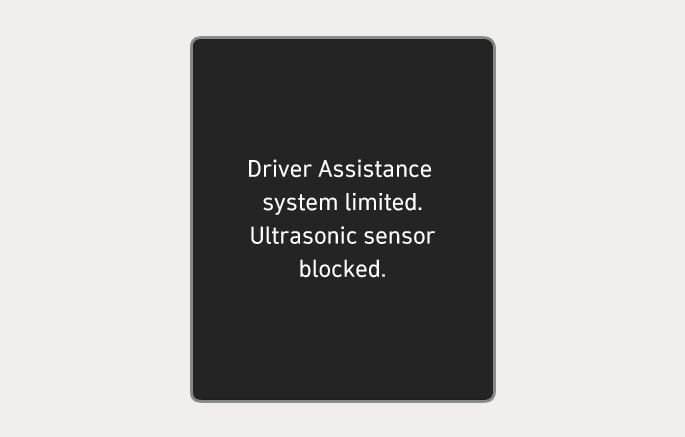 The "Driver Assistance system limited. Camera obscured." or "Driver Assistance system limited. Ultrasonic sensor blocked." warning message appears on the instrument cluster if the following situations occur: