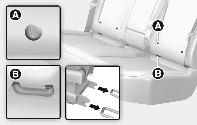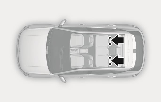 LATCH anchors have been provided in the left and right outboard rear seating positions. Their locations are shown in the illustration. There are no LATCH anchors provided for the center rear seating position.