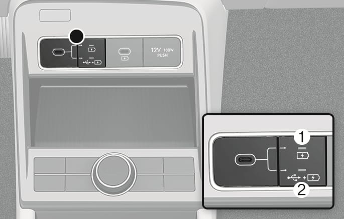 Press the USB port selection button while the vehicle is running. Press the upper portion of the button (1) to charge an electronic device. Press the lower portion of the button (2) to charge and listen to music with a media storage device. The USB port can be used after either indicator light turns on.