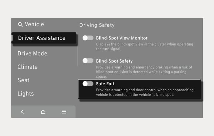 If the vehicle is restarted, Safe Exit Warning will maintain the last setting.