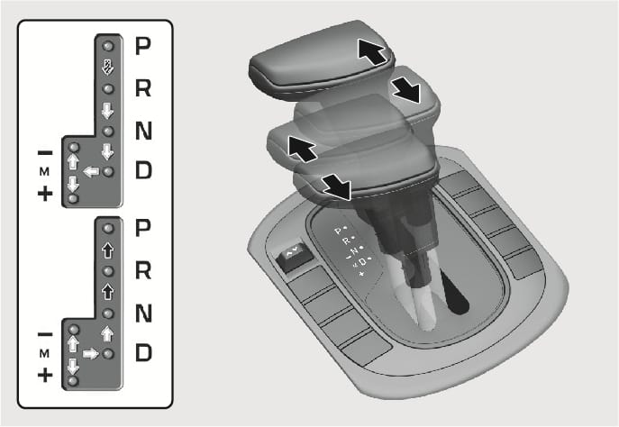 Wenn der Fahrer den Wählhebel in die Position + (nach oben) oder - (nach unten) drückt, schaltet das Getriebe nur dann in den gewünschten Gang, falls sich dieser innerhalb des zulässigen Drehzahlbereichs befindet. Der Fahrer muss das Hochschalten unter Berücksichtigung der Verkehrsbedingungen durchführen und darauf achten, dass die Motordrehzahl unter dem roten Bereich bleibt.