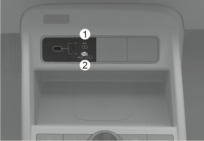 Drücken Sie die Auswahltaste für den USB-Anschluss, während der Motor läuft. Drücken Sie auf den oberen Teil der Taste (1), um ein elektronisches Gerät aufzuladen. Drücken Sie den unteren Teil der Taste (2), um ein Speichermedium zu laden und Musik zu hören. Der USB-Anschluss kann verwendet werden, wenn eine der beiden Kontrollleuchten aufleuchtet.