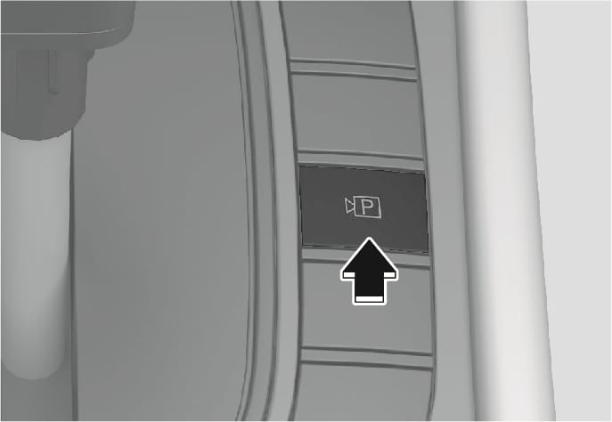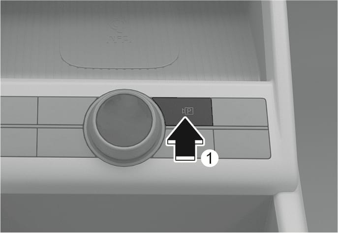 Die Taste Parken/Ansicht (1) wird gedrückt, während der Gang sich in P (Parkstufe), N (Neutral) oder D (Fahrstufe) befindet und die Fahrzeuggeschwindigkeit 10 km/h (6 mph) oder weniger beträgt.