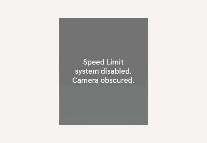 Lorsque le pare-brise où se trouve la caméra avant est couvert d'un corps étranger comme de la neige ou de la pluie, cela peut réduire les performances de détection et limiter ou désactiver temporairement l'assistance connectée de limite de vitesse. Dans ce cas, le message d'avertissement 'Speed Limit system disabled. Camera obscured' et le témoin d’avertissement (