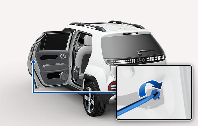 Insert a small blade tool (for example, screwdriver or similar) into the emergency door lock hole and turn it clockwise for left side door, or turn it counterclockwise for right side door.