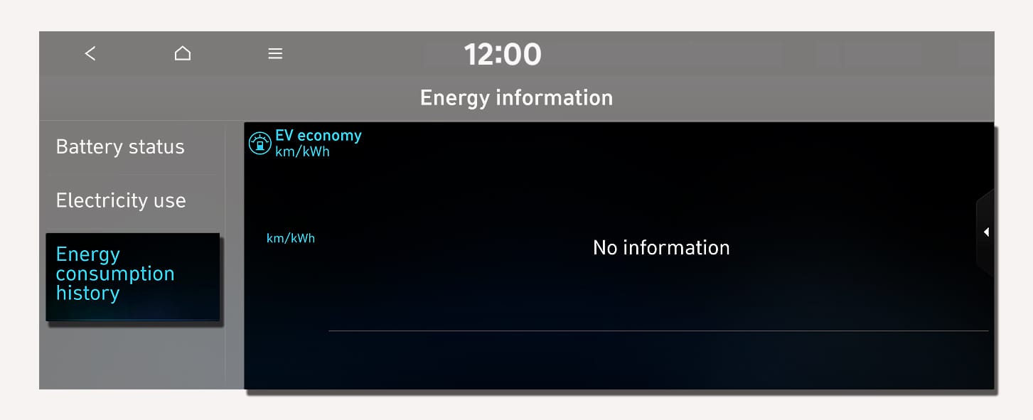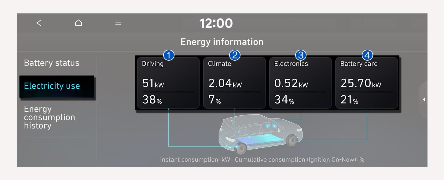 Shows the power and energy consumption used by the vehicle system, including the instrument cluster, infotainment system (speaker and navigation), headlight, vehicle control unit, etc., and the percentage of the power vehicle system used in total power used since starting the vehicle. |
