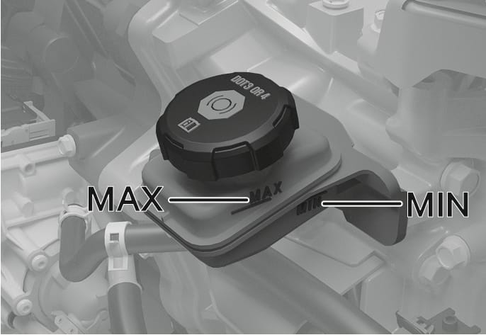 Compruebe el nivel del líquido en el depósito del líquido del actuador del embrague del motor y añada líquido si es necesario.